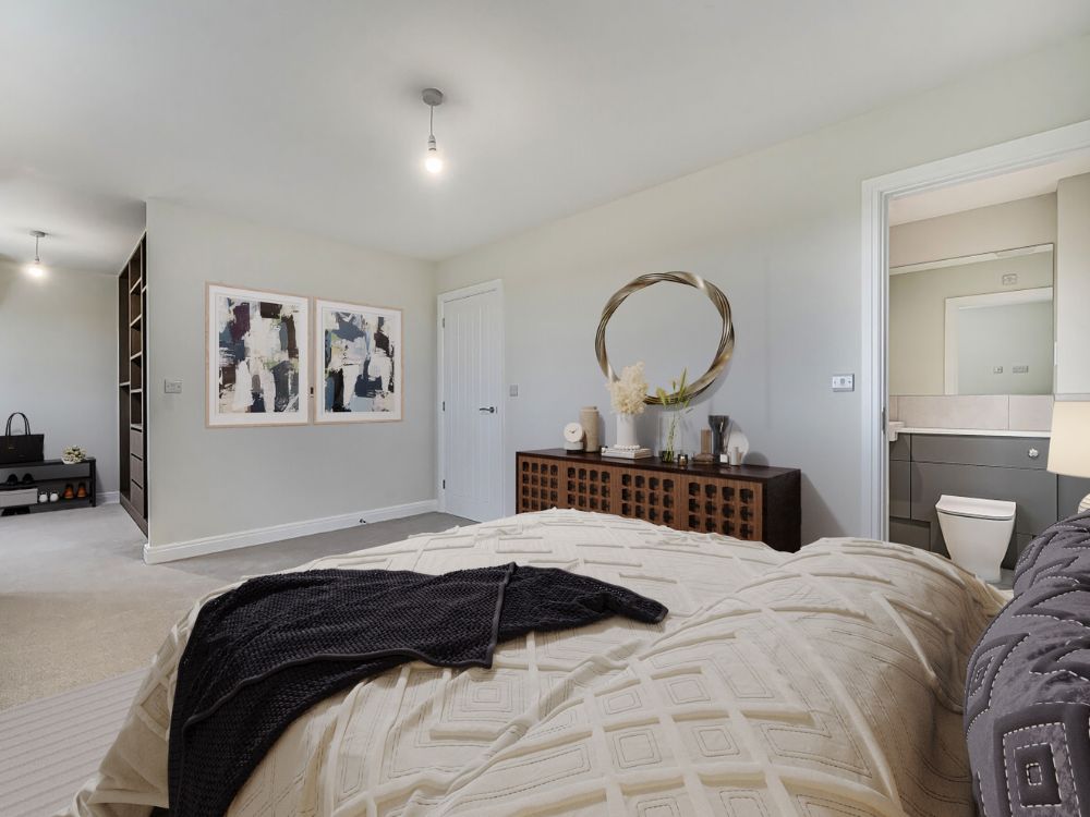 The second floor hosts three well-proportioned bedrooms. The principal bedroom, positioned at the front of the home with stunning scenic views, features its own dressing area and a sleek en-suite shower room, while bedrooms two and three are served by a stylish family bathroom.