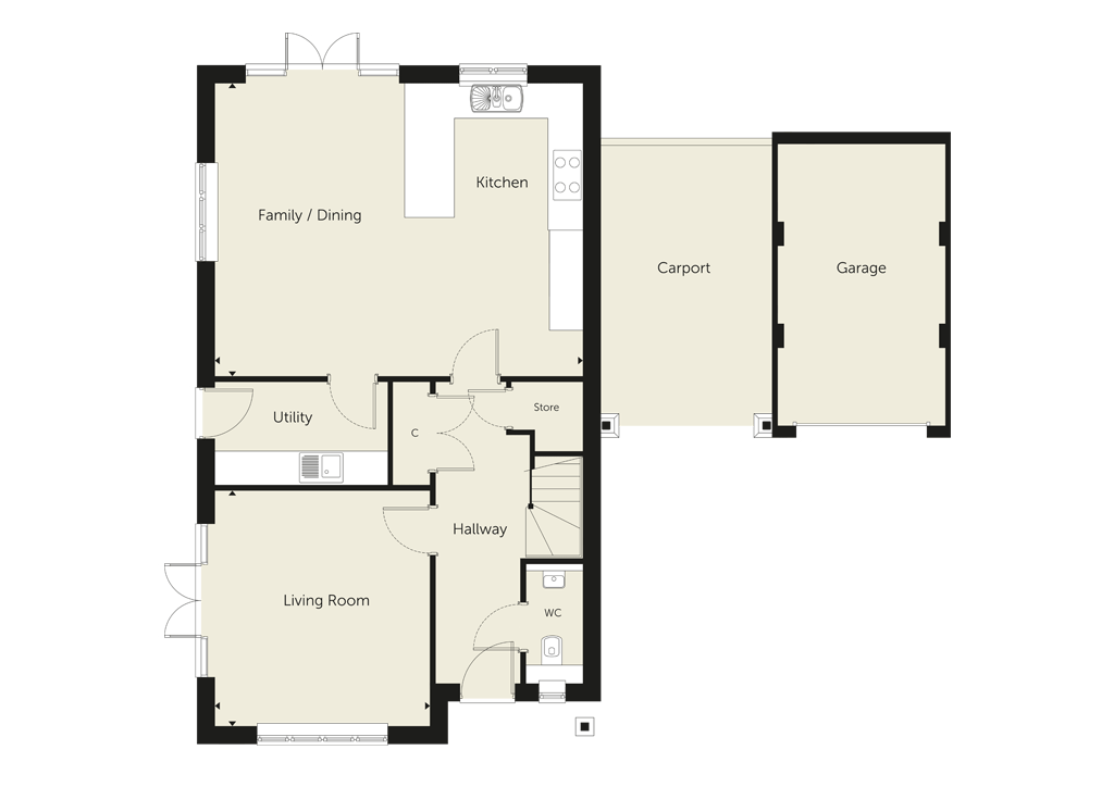 At the heart of the home is the open-plan kitchen/dining/family area, where French doors open onto the spacious wraparound garden, creating a bright and inviting space. A separate utility room, store cupboard and ground-floor cloakroom add to the home’s practical design.