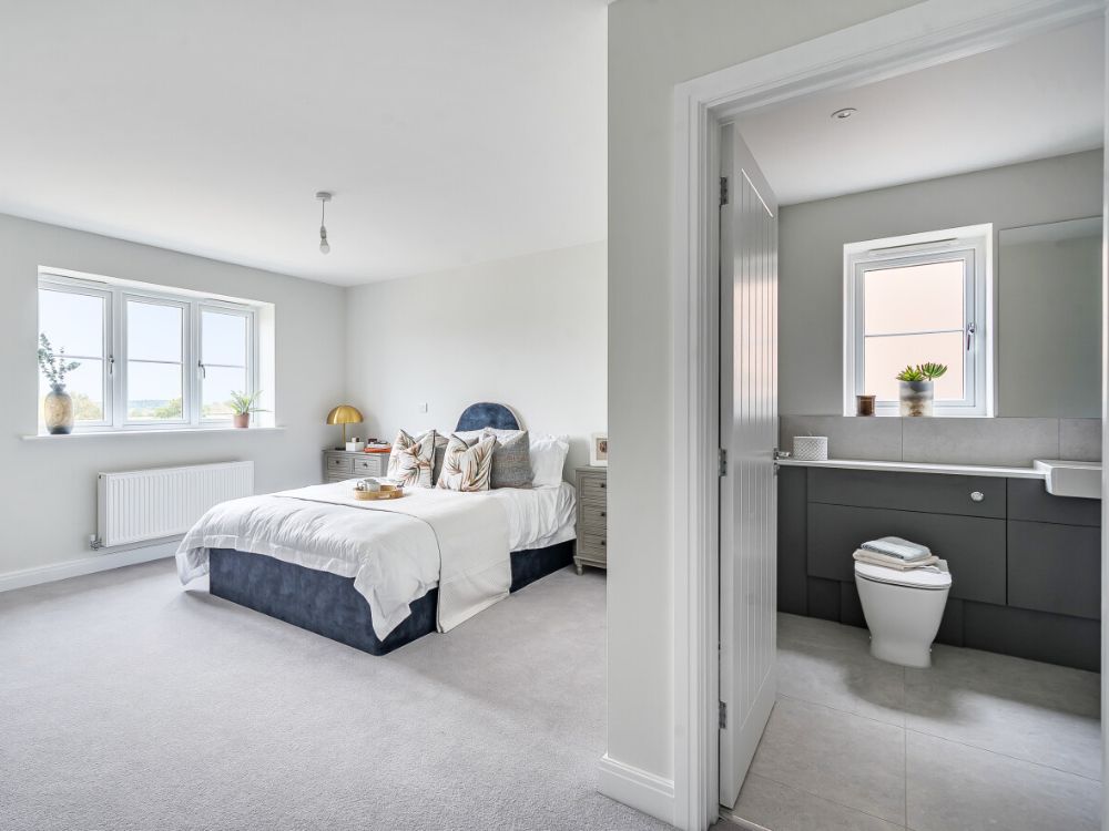 Upstairs, four large double bedrooms provide ample space for family and guests. The master boasts a stylish en-suite shower room and a dedicated dressing area with built-in wardrobes and stunning views. Bedroom two also has an en-suite and fitted storage, with a family bathroom serving bedrooms three and four.